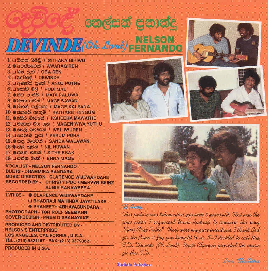 Nelson's CD contains songs written by Bhadraji Mahinda Jayathilaka and Late Clarence Wijewardhana. All music were directed by Clarence as well.