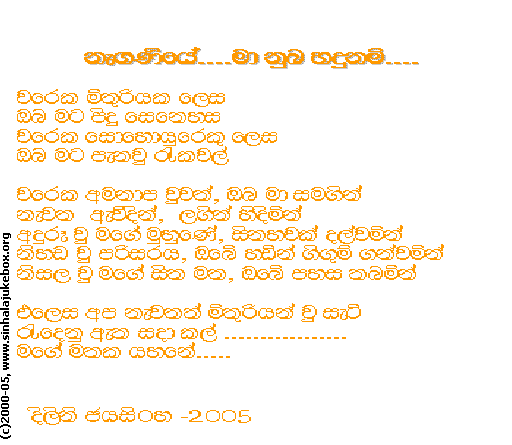 You are hereby invited to submit "Geetha Katha" for possible publication in this page. We reserve the rights to choose what will be presented, yet submitter is responsible for the content and not the page maintainers. We welcome all forms of creative work including but not limited to short stories, jokes, poems, and satire either in Sinhala and/or English.