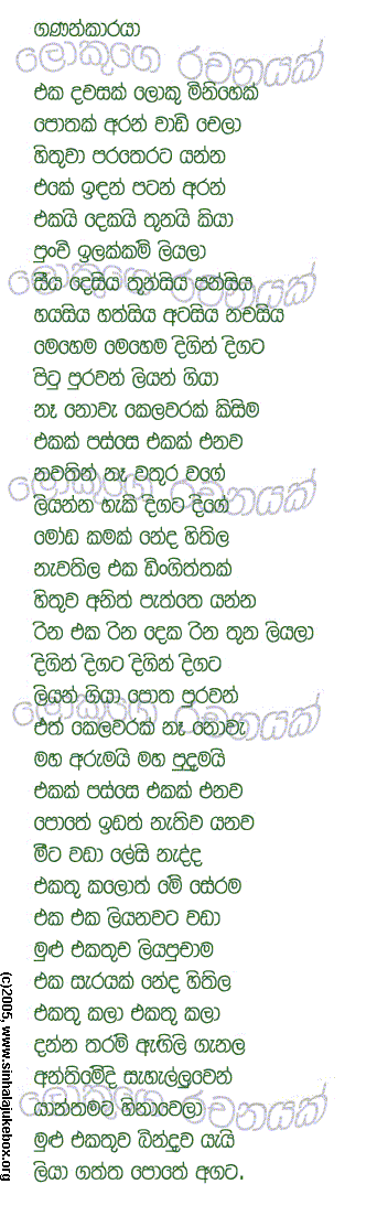 You are hereby invited to submit "Geetha Katha" for possible publication in this page. We reserve the rights to choose what will be presented, yet submitter is responsible for the content and not the page maintainers. We welcome all forms of creative work including but not limited to short stories, jokes, poems, and satire either in Sinhala and/or English.