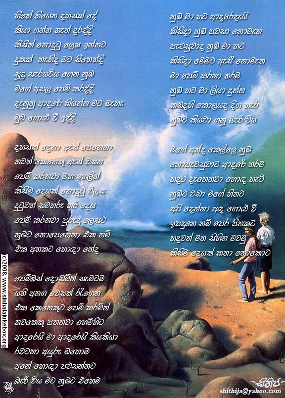 You are hereby invited to submit "Geetha Katha" for possible publication in this page. We reserve the rights to choose what will be presented, yet submitter is responsible for the content and not the page maintainers. We welcome all forms of creative work including but not limited to short stories, jokes, poems, and satire either in Sinhala and/or English.